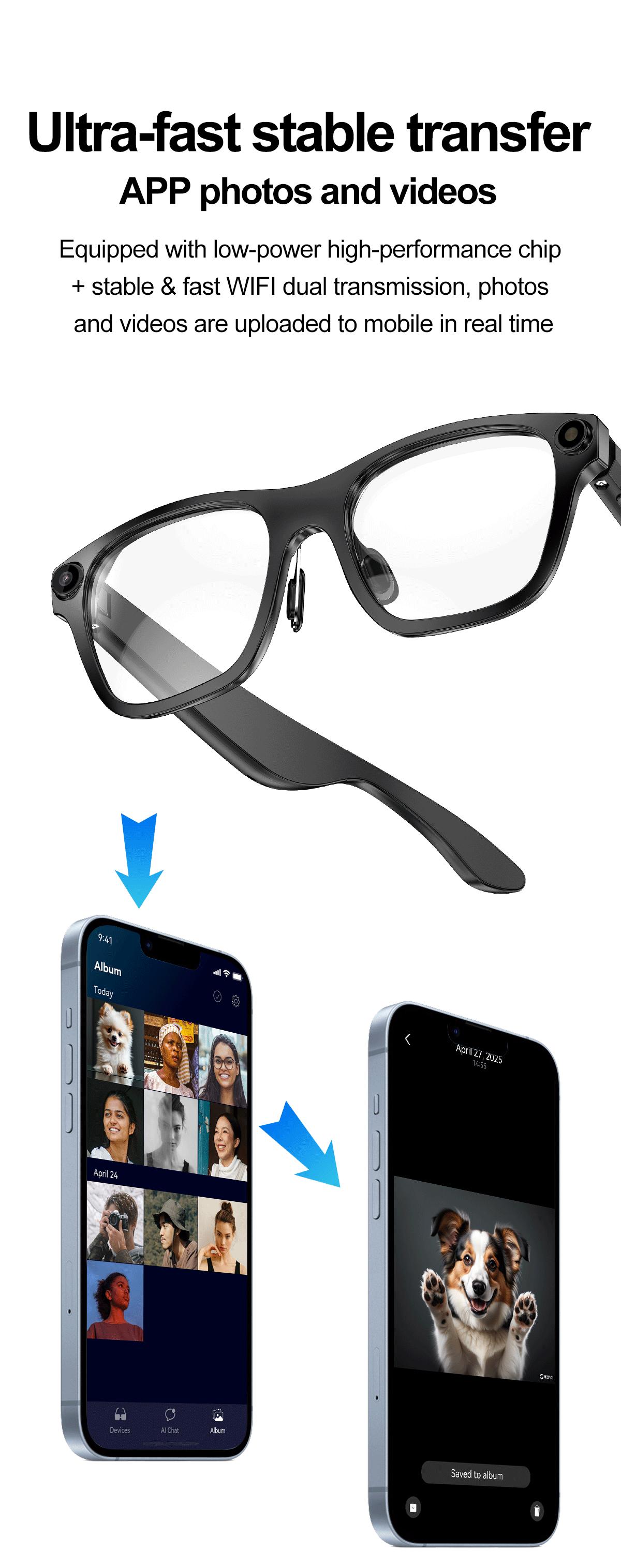 Product Model:S336 Platform: Jieli+Quanzhi Dual Chip Chip: JL7018F Bluetooth : S336 Bluetooth version: V5.4 WIFI:V821 Speaker: Dual Speaker MIC: Dual microphone noise reduction Photo: 2000W pixel, 1080P video, 30 frames per second Camera Pixel: 5 million pixels (default 1080P supports 2K video recording) 30fps Storage: SD NAND patch/32Gb Wear detection: supported Data transmission (photo, video, recording): WIFI Battery: 220mAh Charging method: 2pin magnetic charging Indicator lights: 2 (status indicator lights) LED flash: 1 unit Charging time: about 2 hours Standby time: 4-7 days Call duration: about 7 hours Photo duration: greater than 1 hour Video recording duration: greater than 1 hour Playing music for approximately 7 hours APP:HeyCyan