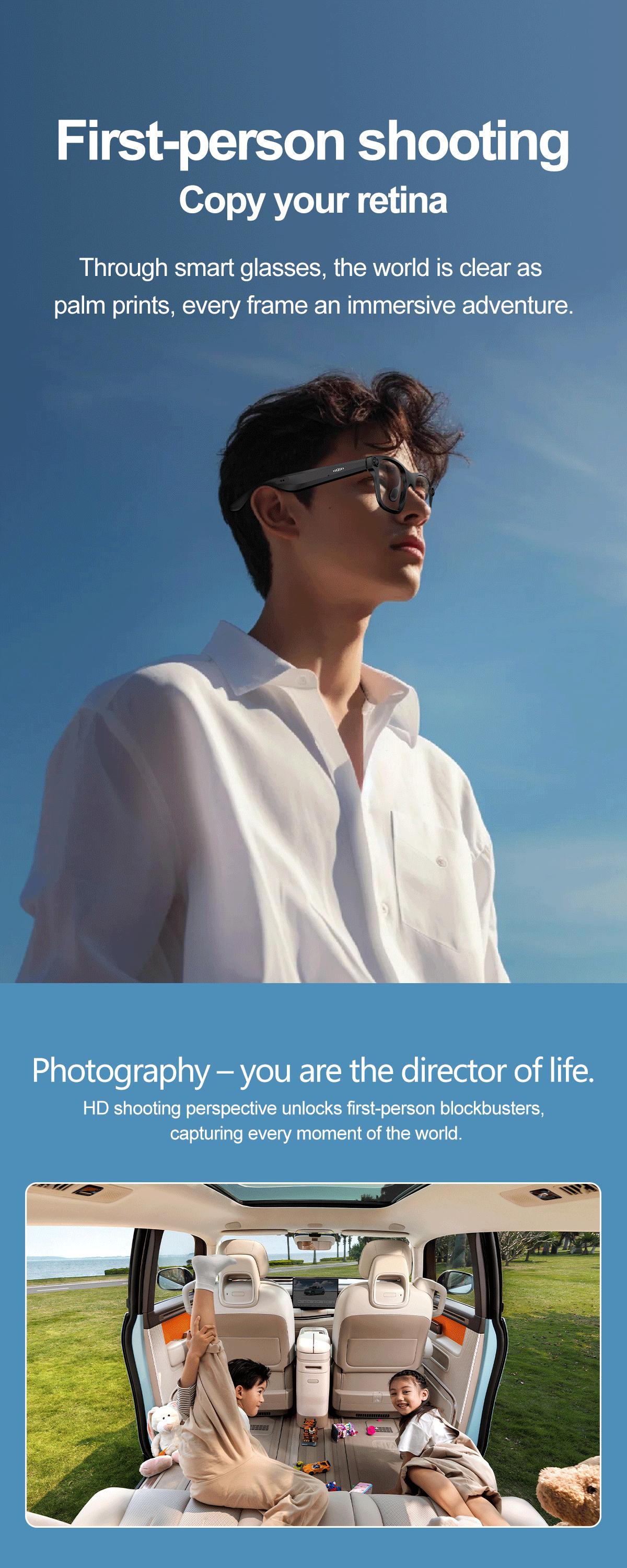 -picture recording 1.1080P 30 frames, automatically segmented and stored in Nand Flash: 2. Video format: Encode H.264, encapsulate AVI; 3. One click recording; 4. The video content supports APP transmission and anti shake algorithm; 5. Support WiFi transmission -take pictures 1. One click photography; 2. Image content, software 2000W, supports WiFi transmission -sound recording 1. One click recording; 2. Recording format: wav3. Supports WiFi transmission -OTA upgrade Connect to the app via Bluetooth for OTA upgrade -Music playback Support Bluetooth music push for mainstream phones such as iPhone/Android/HarmonyOS -Voice call When calling, click to answer the call/when making a call, click to hang up the call (physical key on the right leg); 2. When receiving a call, long press and hold for three seconds to reject the call (physical button on the right leg) -AI functionality Domestic bean buns/overseas chatgpt 1. AI image recognition 2. AI dialogue 3. Translation (Microsoft/University of Science and Technology) 4. Meeting minutes -Reminder sound Power on/off prompt sound/photo prompt sound/video prompt sound -Power on/off Left leg toggle switch, toggle forward to turn on, toggle backward to turn off -Pairing/unbinding 1. Scan the QR code to download the app; 2. Bluetooth search; 3. Automatic reconnection; -AI voice assistant Voice call 'Hello Little Orange' to wake up the glasses AI voice assistant -Left physical button Flip the switch forward to turn on and backward to turn off -Right physical button Take a photo, short press Recording, double-click the button to enter recording, short press to end recording Recording, long press for 2 seconds to enter recording, short press to end recording -Right touchpad Play/pause music: double-click on the touch area Adjust volume: slide forward to increase volume, slide backward to decrease volume Switch to next track: Three tap touch area